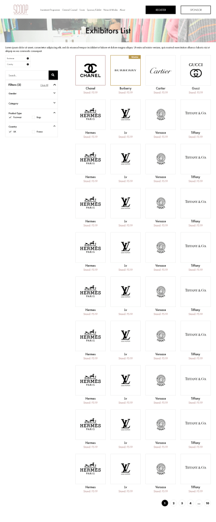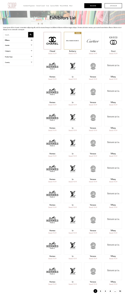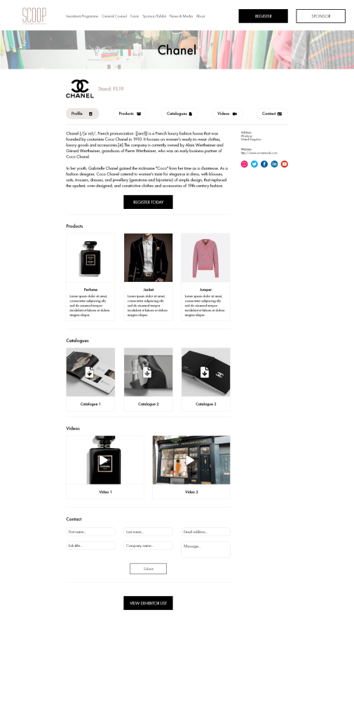 - Exhibitor Directory Listing: Example from Scoop’s directory showcasing well-structured profiles with product highlights and brochures.