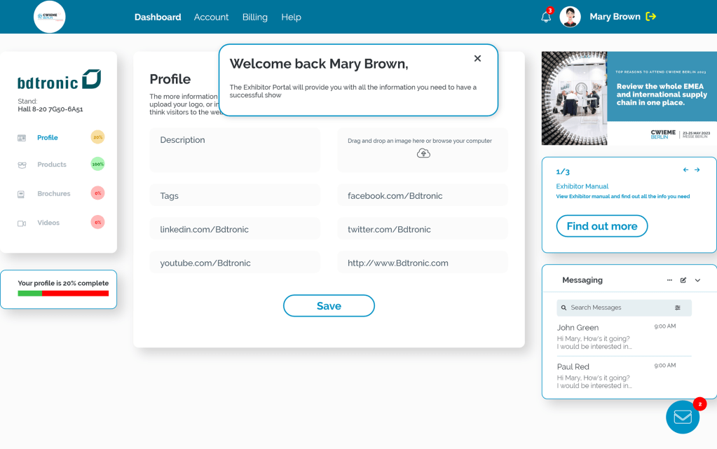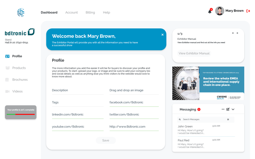 Project Overview The Exhibitor Portal is a centralized dashboard designed for exhibitors participating in trade shows. This platform enables exhibitors to efficiently manage their company details, products, and brochures, which are then published in the exhibitor list directory for visitors to explore. The primary exhibitor group for this platform is Hyve, which manages events across the UK, US, and Asia, such as Breakbulk, Springfair, and Bett. This case study leverages the branding of CWIEME, a coil wind and motors trade show, to create a representative mockup.